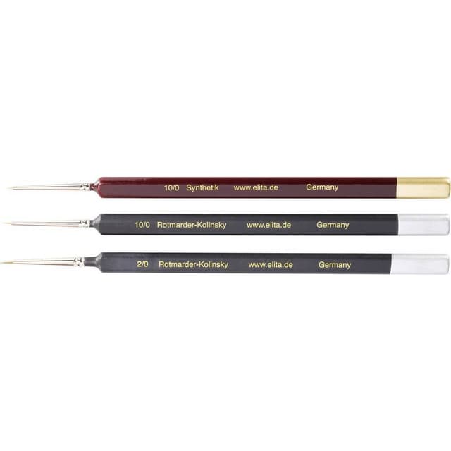 Miniatyrpenselsats med ergonomiskt utformade trekantiga skaft. Penslarna ligger perfekt i handen. Punktexakt arbete med de minsta penselstorlekarna underlättas tack vare detta. Mycket högvärdig Rotmarder-Kolinsky och syntetiska hår av bästa kvalitet, tillverkade i Tyskland, med sömlös silvertving, nitrofast bearbetat med hårskyddshylsa.