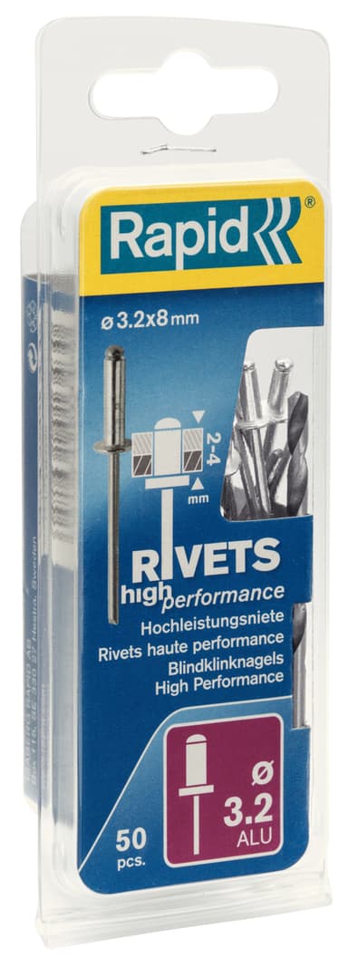 High Performance-aluminiumnitar. Storlek: Ø3,2 x 8 mm. Antal: 50 st. Inkl. borr Till: RP10 , RP40, RP60, RP100 Användningsområde: registreringsskyltar, stänkskärmar, metall- och plastöverdrag, namnskyltar, metallplattor, reparationerLäs mer om produkten