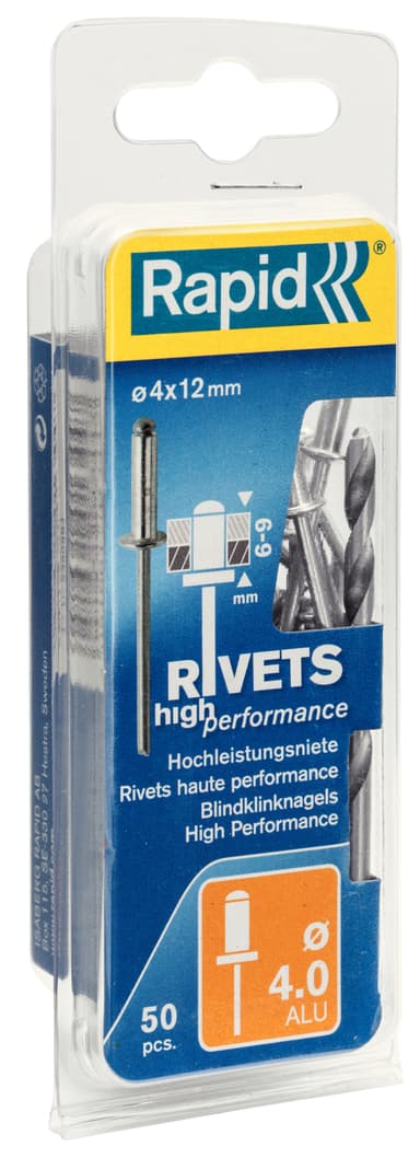 High Performance-aluminiumnitar. Storlek: Ø4,0 x 12 mm. Antal: 50 st. Inkl. borr Till: RP10 , RP40, RP60, RP100 Användningsområde: registreringsskyltar, stänkskärmar, metall- och plastöverdrag, namnskyltar, metallplattor, reparationerLäs mer om produkten