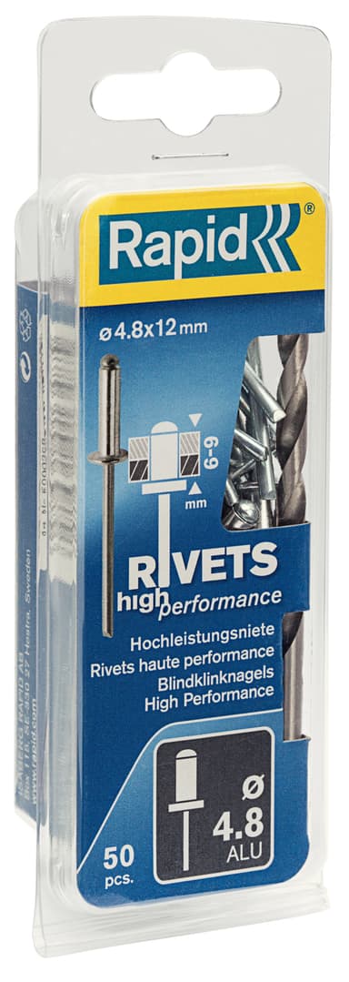 High Performance-aluminiumnitar. Storlek: Ø4,8 x 12 mm. Antal: 50 st. Inkl. borr Till: RP10 , RP40, RP60, RP100 Användningsområde: registreringsskyltar, stänkskärmar, metall- och plastöverdrag, namnskyltar m.m.Läs mer om produkten