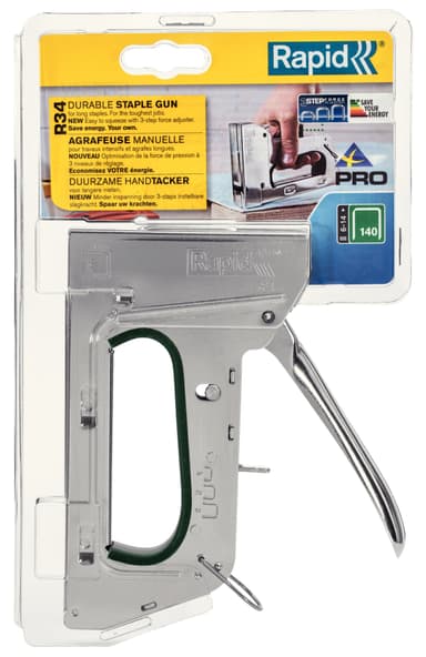Häftklammertyp: 140 Benlängd: 6-14 mm Mått: 39 x 132 x 285 mm Material: stål Rekylfri, låsfunktion, stötdämpare. 3-stegs tryckjustering. Lämpad att säkra tak, dukar etc.Läs mer om produkten