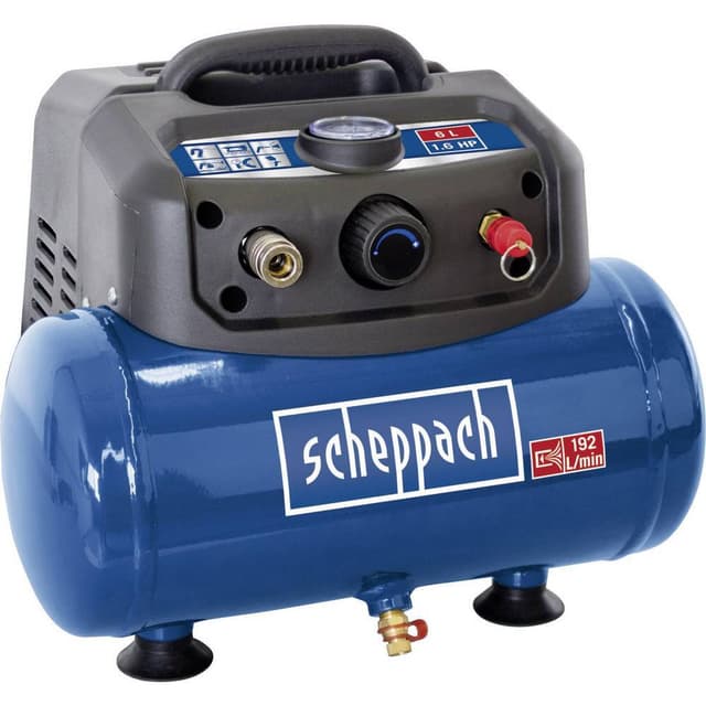 Scheppach Tryckluftskompressor HC06 6 l 8 barEndast lätt 9,8 kg vikt · oljefri, underhållsfri kompressor med lång livslängd · Insugningseffekt 192 L/min · kraftig 1200 W motoreffekt · Pannstorlek 6 L · max. Arbetstryck 8 bar · inklusive omfattande