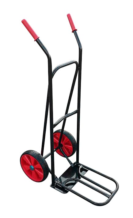 Sekketralle med kraftig 22 mm rørunderstell, utfallsramme og håndtak med softgrip Maks. belastning på fastplatens midtpunkt: 150 kg Maks. belastning på utfallsrammens midtpunkt: 60 kg Total høyde: 108 cm Total bredde: 43 cm Akseldiameter: 19 mm Vekt: 6,7 kg Utfallsramme: 29×40 cm Fast plate: 35×14 cm Punkteringsfrie hjul. Dekkstørrelse: Ø250×45 mm Felg: Stål med kulelager Sekketrallen er utstyrt med en kraftig utfallsramme for enkel håndtering av lasten og punkteringsfrie hjul montert på ABS-felger. Alt stål er sandblåst og grunnbehandlet før den siste pulverlakkeringen.