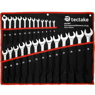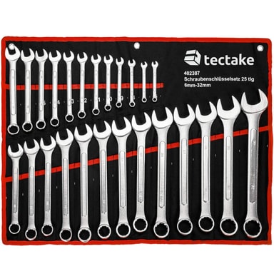Med den praktiska blocknyckelsatsen i 25 delar från tectake har du alltid en passande u-nyckel eller ringnyckel till hands. Skruvnyckelsatsen består av 25 olika skruvnycklar. Höjdpunkt: blocknycklarna levereras i en ändamålsenlig hopfällbart fodral så att varje nyckel har sin plats. Fodralet har öglor så att verktygen praktiskt kan fästas på väggen. Hämta hem blocknyckelsatsen från tectake redan idag.