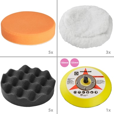 • 5 våfflade polersvampar medel 150 mm (Passar för att lägga på polering utan stänk. Kan användas för att ta bort små ojämnheter i lacken. Bästa resultat vid mörkt lack)