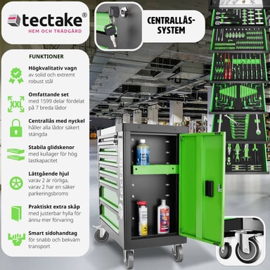 Oavsett om du är en erfaren hemmafixare eller nybörjare, är denna verktygsvagn det perfekta valet för att hålla din arbetsplats ren och effektiv. Verktygsvagnen är utrustad med 1599 delar, vilket innebär att du har allt du behöver på ett och samma ställe. De sju kullagrade lådorna kan dras ut helt, vilket ger enkel tillgång även vid hög belastning. Du behöver aldrig oroa dig för att verktygen inte ska få plats eller vara svåra att hitta.