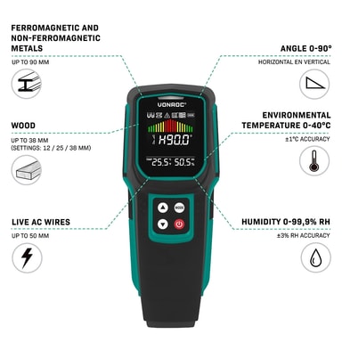 Denna multidetektor gör mer än du tror. Samtidigt som den skannar får du realtidsdata om rumstemperatur (0–40 °C) och luftfuktighet (0–99,9%), båda med hög noggrannhet och en maxavvikelse på endast ±1 °C respektive ±3 % RH. Dessutom har den en inbyggd digital vinkelmätare som gör att du snabbt och exakt kan mäta både horisontella och vertikala vinklar. Kort sagt: med denna praktiska enhet kan du kartlägga alla dolda element i ett rum på ett tillförlitligt och detaljerat sätt.