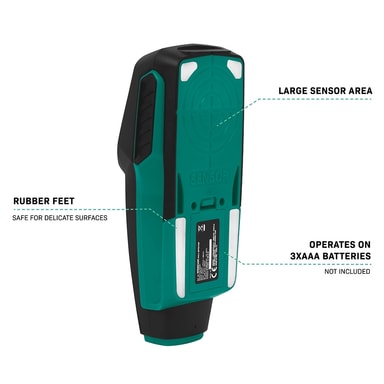 Det robusta, kompakta höljet är lätt och ergonomiskt utformat med soft grip, vilket gör väggdetektorn bekväm att hålla. Gummifötter på bottenplattan gör att den kan användas säkert även på känsliga väggytor. Det stora sensorområdet säkerställer att du alltid vet exakt var du mäter.