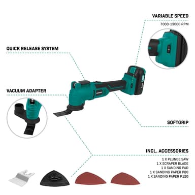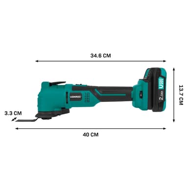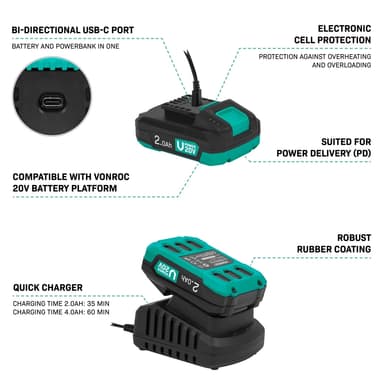Multiverktyget levereras som ett komplett set, inklusive ett 2,0Ah-batteri och en snabbladdare. Dessa tillhör VONROC VPower 20V-plattformen och kan kombineras med alla andra maskiner i samma serie. Ett batteri – oändliga möjligheter!