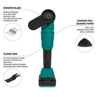 Detta multiverktyg levereras med ett skrapblad, ett sänksågblad och en slipplatta (med matchande sandpapper). Letar du efter ännu fler tillbehör? Kolla in detta praktiska set:
