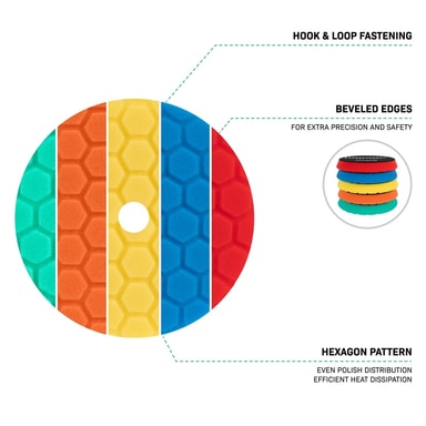 De medföljande polerrondellerna (även kallade polersvampar) har fasade kanter, vilket gör det enklare att arbeta i trånga utrymmen och förhindrar att stödrondellen eller maskinen vidrör ytan. Hexagonmönstret säkerställer jämn spridning av polermedel och effektiv värmeavledning. Rondellerna är färgkodade för enkel identifiering: