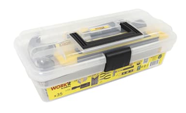 Verktøykasse med 34 stk. basisverktøy, kløfthammer, sideavbiter, spisstang, målebånd, kniv med bryteblad, torpedovaterpass, unbrakonøkler, miniskrutrekkere pluss skrutrekkerhåndtak med holder og 12 bits.Läs mer om produkten