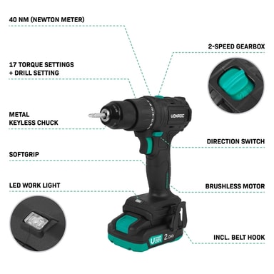 Med VONROC PRO CD511DC i handen känns varje uppgift enklare och smidigare. Maskinen är kompakt, kraftfull och byggd för krävande användning. Den kolborstfria motorn ger mer kraft utan att öka vikten, och den exakta kontrollen över moment och hastighet gör att du alltid jobbar i rätt tempo. Oavsett om du skruvar, borrar eller monterar – den här PRO-modellen levererar det du behöver.