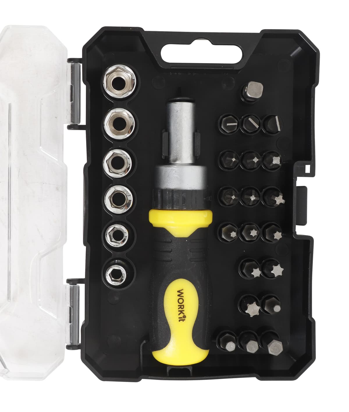 WORK It® spärrskruvmejselsats med 19 bits och 6 hylsor i praktisk låda, totalt 27 delar.Läs mer om produkten