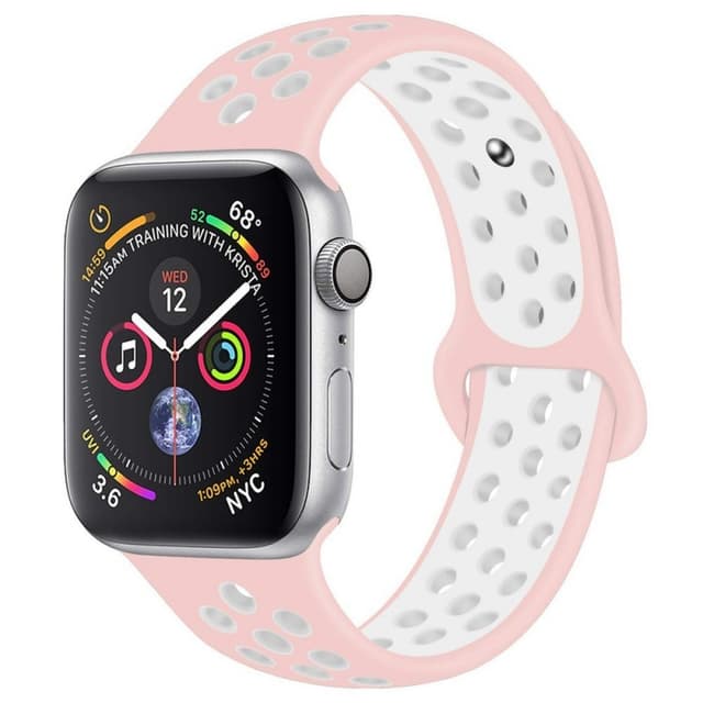 Tufft ventilerat sportarmband med knapplåsning.  Specifikationer Färg: Rosa/vit Passar: Apple Watch 4 (44)  Infästning: 44mm Längd: 95mm+140mm Innehåll 1 x Silikon Sport Armband