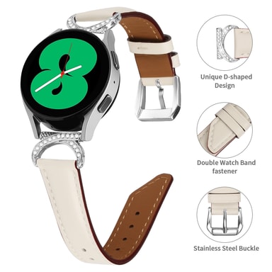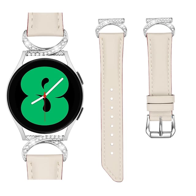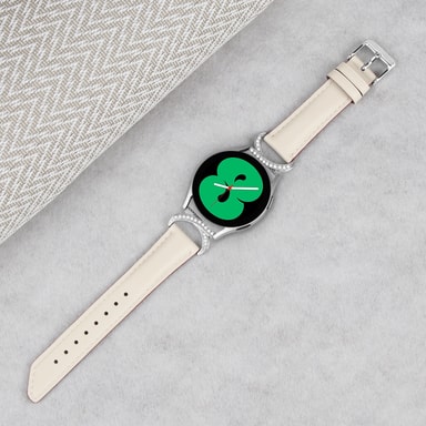 Klockarmbandet är av förstklassigt äkta läder med ett vackert fäste med glittrande zirkonstenar. Remmen är lätt att byta och ger din Samsung Galaxy Watch 4/5 ett elegant utseende.