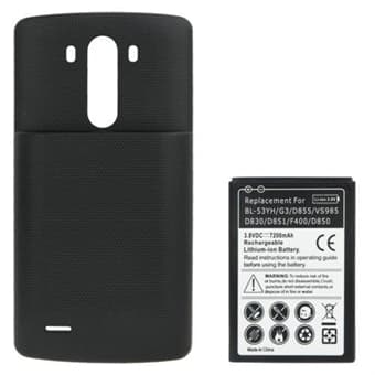 Batteri till lg g3 + bakskal batteriet passar: lg g3 / d855 / vs985 / d830 / d851 / f400 / d850 tekniska data och specifikationer - typ: li-ion - kapacitet: 7200mah - volt: 3.7v - med egen baksida/bakskal i svart då batteriet är tjockare än originalet