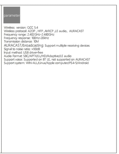 NÖRDIC Bluetooth 5.4 ljudsändare med aptX LL/HD Adaptive & Auracast är utrustad med Qualcomm QCC-chip och den senaste Bluetooth 5.4-teknologin för stabil och högkvalitativ ljudöverföring. Perfekt för gaming, musik och trådlös ljudanslutning utan fördröjning.Specifikationer:
