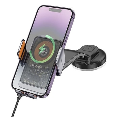Hoco bilhållare med trådlös laddning är designad för säker och bekväm användning av din smartphone under körning. Den monteras enkelt på vindrutan eller instrumentpanelen och erbjuder trådlös laddning med en effekt på upp till 15 W.