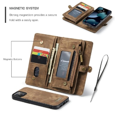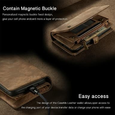 Blixtlås fack för kontanter. Tillverkad i retrostil split läder + plastmaterial, hög kvalitet och hållbar. Löstagbar 2-i-1 design, läder och inre läder belagt hård skal. Magnetlås och snäppfäste för säker förvaring av kort och kontanter. Skydda din telefon från daglig skada och bär dina tillhörigheter med stil.