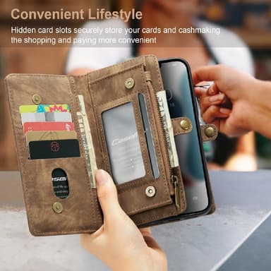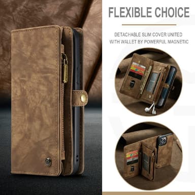 Blixtlås fack för kontanter. Tillverkad i retrostil split läder + plastmaterial, hög kvalitet och hållbar. Löstagbar 2-i-1 design, läder och inre läder belagt hård skal. Magnetlås och snäppfäste för säker förvaring av kort och kontanter. Skydda din telefon från daglig skada och bär dina tillhörigheter med stil.