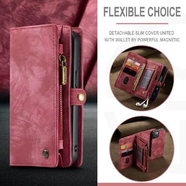 Blixtlås fack för kontanter. Tillverkad i retrostil split läder + plastmaterial, hög kvalitet och hållbar. Löstagbar 2-i-1 design, läder och inre läder belagt hård skal. Magnetlås och snäppfäste för säker förvaring av kort och kontanter. Skydda din telefon från daglig skada och bär dina tillhörigheter med stil.