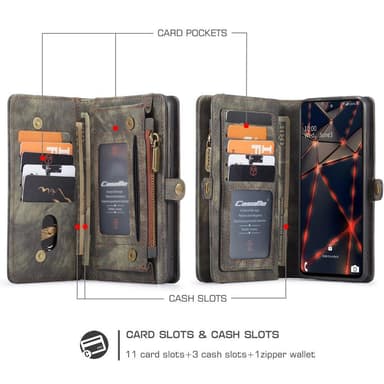 Blixtlås fack för kontanter. Tillverkad i retrostil split läder + plastmaterial, hög kvalitet och hållbar. Löstagbar 2-i-1 design, läder och inre läder belagt hård skal. Magnetlås och snäppfäste för säker förvaring av kort och kontanter. Skydda din telefon från daglig skada och bär dina tillhörigheter med stil.