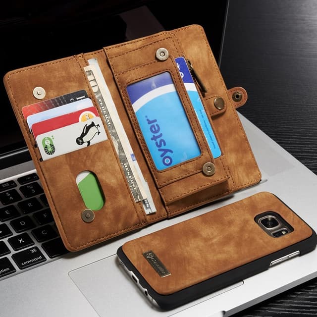 Blixtlås fack för kontanter. Tillverkad i retrostil split läder + plastmaterial, hög kvalitet och hållbar. Löstagbar 2-i-1 design, läder och inre läder belagt hård skal. Magnetlås och snäppfäste för säker förvaring av kort och kontanter. Skydda din telefon från daglig skada och bär dina tillhörigheter med stil.