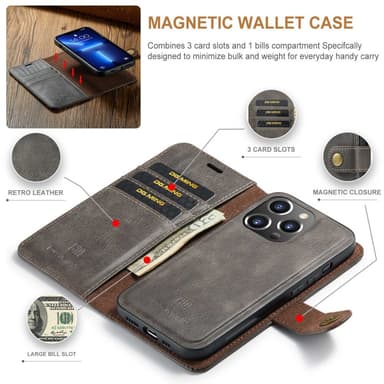 DG MING iPhone 14 Pro Max 2-i-1 Magnet Plånboksfodral - Grå