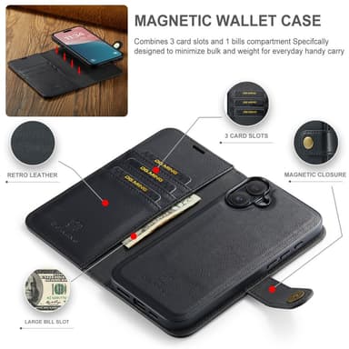 DG MING iPhone 16 Plus 2-i-1 Magnet Plånboksfodral - Svart