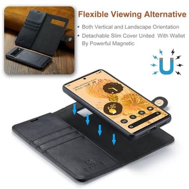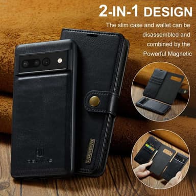 DG.MING Split läderfodral för Google Pixel 7 Pro, stötsäkert, avtagbart mobiltelefonfodral med plånboksställ - svart