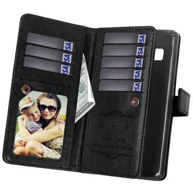 Mobilplånbok Dubbelflip 9-kort - Stryktålig silikon ram (flexi) håller telefonen på plats. - Dolt magnetlås håller mobilplånboken stängd. - Kortplatserna stängs med ett knapplås. - Slät sida som skyddar telefonens display. Specifikationer                    Färg: Svart, brun, röd, rosa, vit, ljusblå Antal kortplatser: 9st (varav 1 fotoficka) Antal sedelfack: 2st Fotofickor:1st Övrigt: Hål för handledsrem Passar: Samsung Galaxy S10 Plus Modellnr: SM-G975F Material: PU läder