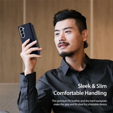 Bril Series är ett elegant och funktionellt fodral designat för vikbara enheter. Den smidiga kombinationen av PU-läder och hård baksida ger ett bekvämt grepp, perfekt för daglig användning. Ett inbyggt fack för styluspenna håller pennan säker och lättillgänglig (stylus ingår ej). Det kreativa stället möjliggör handsfree-användning, idealiskt för videosamtal eller filmvisning. Ett separat kortfack gör det enkelt att bära med sig ett kreditkort. Fodralets folio-design skyddar både telefonen och dess gångjärn mot stötar och repor. Dessutom är det kompatibelt med trådlös laddning, så du slipper ta av fodralet vid laddning.