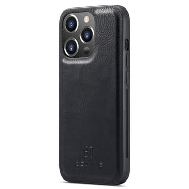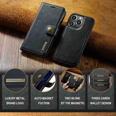 DG.MING Split läderfodral för iPhone 14 Pro, stötsäkert, avtagbart mobiltelefonfodral med plånboksställ - svart