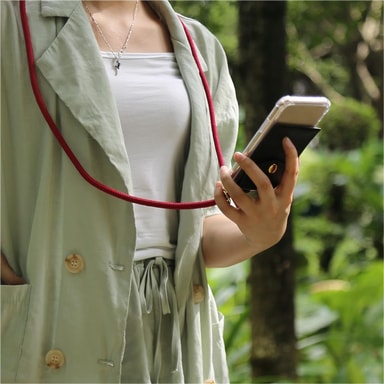 SKYDD: TPU-silikonfodralet skyddar mobilens kanter och hörn. De högkvalitativa karbinhakarna håller telefonen väl fast på det rivningsbeständiga repet. Fodralet är robust och hålls på plats med tryckknappar.