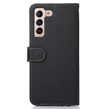 KHAZNEH RFID Blocking Litchi Texture PU-läderfodral med remstativ Plånbok Fallsäkert skal för Samsung Galaxy S23 - Svart/Röd