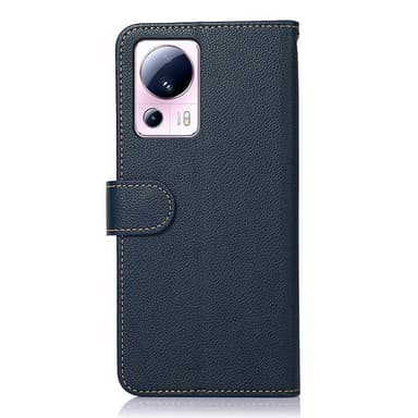KHAZNEH RFID Blocking Litchi Texture PU-läderfodral med remstativ Plånbok Fallsäkert skal för Xiaomi 13 Lite - Blå/Brun