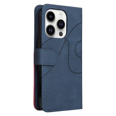 För iPhone 15 Pro KT Series-1 Dubbelfärgad fodral med rem - BlåTillverkad av PU-läder och TPU-material, skydd i två lagerFashionabla tvåfärgade skarvningsdesign med oregelbundna linjerPlånboksstil: 2 kortplatser + 1 fotofack + 1 kontantfickaStödställLäs mer om produkten
