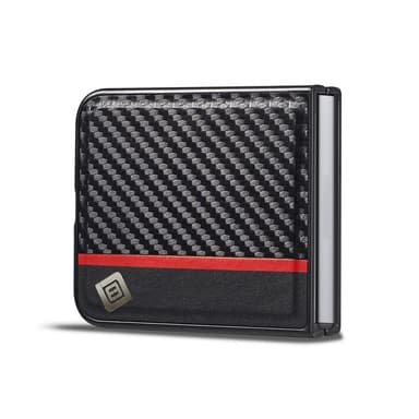 TPU + EVA 2-i-1 hybrid bottendel, hållbar och reptålig. Yta i kolfiberstruktur och PU-läder med fin textur och röd vertikal rand, snyggt utseende. Aluminiumlegeringslogotypen visar den höga kvaliteten.