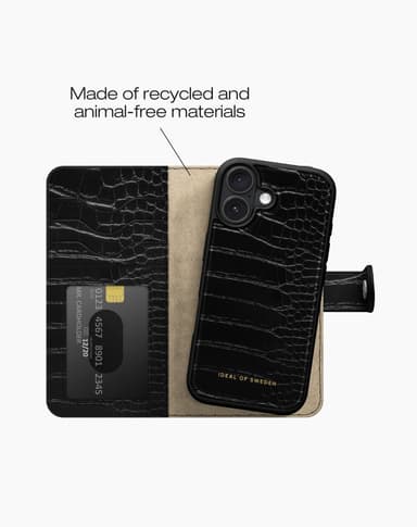 MATERIAL Yttre plånboksskal: återvunnen polyuretan och polyuretan Inre skal: återvunnen polyester och polyester Foder: återvunnen polyester och polyester Yttre mobilskal: återvunnen polyuretan och polyuretan Inre mobilskal: återvunnen polykarbonat och polykarbonat