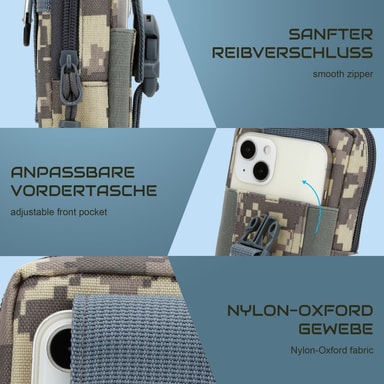 Väskan är tillverkad av högkvalitativ, stänksäker och nötningsbeständig polyester och är robust och skyddar dina enheter från repor och skador. Den kamouflagemönstrade designen ger väskan en snygg, militär design som matchar din friluftsutrustning.