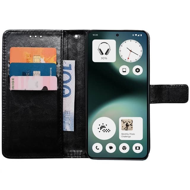 En elegant kombination av funktionalitet och stil. Utrustat med tre kortfack kan du enkelt bära med dig dina viktigaste bankkort, ID-kort eller kontanter så att du alltid har dem inom räckhåll. Mobiltelefonen sitter fast i en modellanpassad ram av silikon. Fodralet skyddar hela telefonen. Åtkomst för telefonens funktioner. Mobilfodralet har även integrerad ställfunktion, perfekt för filmvisning. Dolt magnetlås håller plånboken stängd.