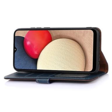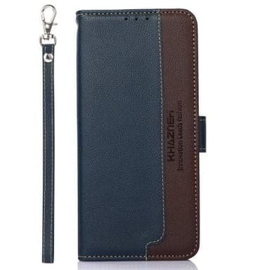KHAZNEH RFID Blocking Litchi Texture PU-läderfodral med remstativ Plånbok Fallsäkert skal för Samsung Galaxy S23+ (Plus) - Blå/Brun