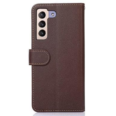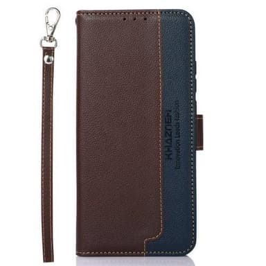 KHAZNEH RFID Blocking Litchi Texture PU-läderfodral med remstativ Plånbok Fallsäkert skal för Samsung Galaxy S23+ (Plus) - Brun/Blå