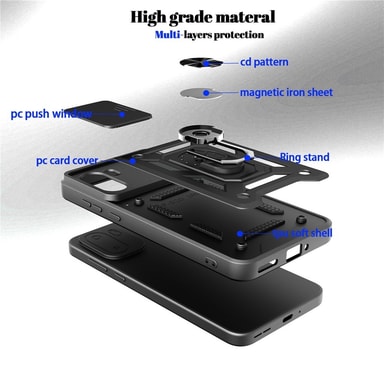 Upplev ultimat skydd och funktionalitet med Armor Metallring Kameraslider. Detta skal är designat för att ge din telefon ett elegant utseende samtidigt som det skyddar mot vardagliga utmaningar. Den inbyggda roterbara ringen gör det enkelt att använda telefonen med en hand och justera betraktningsvinkeln, medan den magnetiska hållarens kompatibilitet säkerställer stabil placering i bilen.