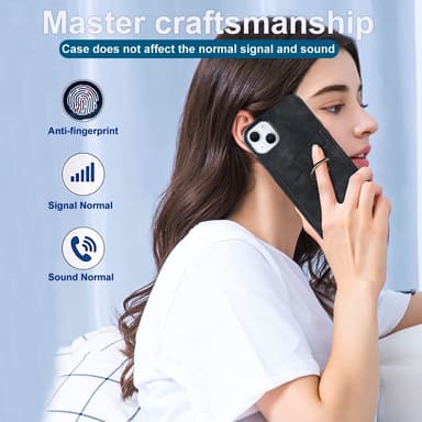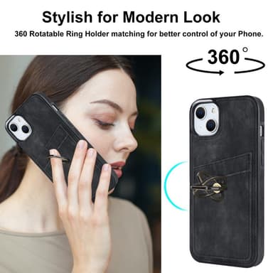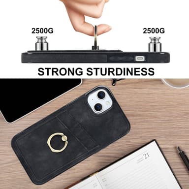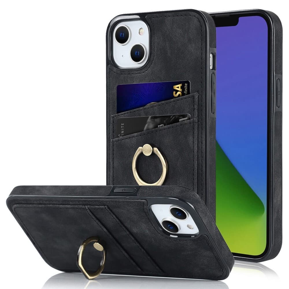 Ett TPU-skal med PU-läder med två stycken kortfack på baksidan. Ställbar ring monterad på baksidan av skalet för bättre grepp och kan även användas som ställ.
