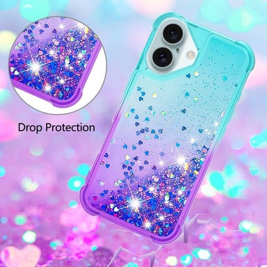 Ett TPU-skal med flyttande vätska med glitter och hjärtan som skyddar bra mot stötar och tappskador.