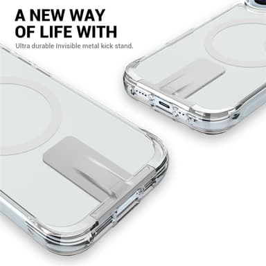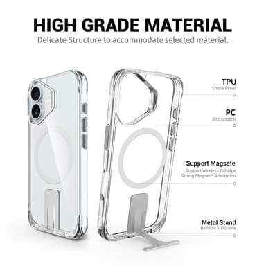 Detta transparenta mobilskal kombinerar stil med funktionalitet. Med inbyggd magnetring är det fullt kompatibelt med MagSafe-tillbehör och möjliggör trådlös laddning. Tillverkat av TPU och PC för att ge ett slitstarkt skydd mot stötar och fall. Det genomskinliga materialet framhäver telefonens ursprungliga design. Det integrerade stället i aluminiumlegering gör det enkelt att titta på skärmen både horisontellt och vertikalt utan att hålla i telefonen. Upphöjda kanter skyddar skärm och kamera från repor och stötar.