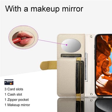 ESEBLE E11 Litchi Mirror är ett elegant och funktionellt mobilfodral tillverkat av PU-läder med litchistruktur och ett slitstarkt TPU-inre som ger effektivt skydd mot stötar. Fodralet har tre kortfack, ett kontantfack, en dragkedjeficka samt en inbyggd sminkspegel i akryl – perfekt för vardagsbruk. Det inbyggda stället möjliggör handsfree-visning i olika vinklar, vilket gör det idealiskt för videor, läsning eller videosamtal. Fodralet ger heltäckande skydd med upphöjda kanter runt skärm och kamera. Den medföljande handledsremmen ger extra säkerhet och bekvämlighet vid användning.