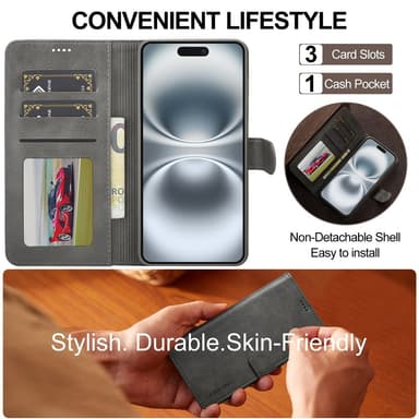 Detta eleganta fodral är tillverkat av PU-läder med kalvliknande textur och TPU-material, vilket ger en mjuk känsla och ett stilrent utseende. Det erbjuder 360-graders skydd för din telefon och kombinerar funktionalitet med design. Med två kortfack, ett fotofack och ett kontantfack kan du lämna plånboken hemma. Det vikbara stället gör det enkelt att titta på innehåll handsfree, medan det starka magnetlåset håller allt säkert på plats. Ett reserverat hål för högtalaren gör att du kan prata i telefon även med fodralet stängt.